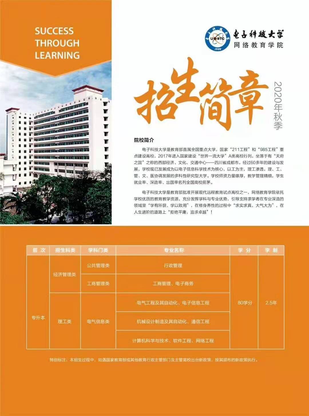 学校原名成都电讯工程学院,是1956年在周恩来总理的亲自部署下,由交通大学(现上海交通大学、西安交通大学)、南京工学院(现东南大学)、华南工学院(现华南理工大学)的电讯工程有关专业合并创建而成,1960年被中共中央列为全国重点高等学校,1961年被中共中央确定为七所国防工业院校之一,1988年更名为电子科技大学,1997年被确定为国家首批“211工程”建设的重点大学,2000年由原信息产业部主管划转为教育部主管,2001年进入国家“985工程”重点建设大学行列。经过60年的建设,学校形成了从本科到硕士研究生、博士研究生等多层次、多类型的人才培养格局,成为一所完整覆盖整个电子类学科,以电子信息科学技术为核心,以工为主,理工渗透,理、工、管、文协调发展的多科性研究型大学。