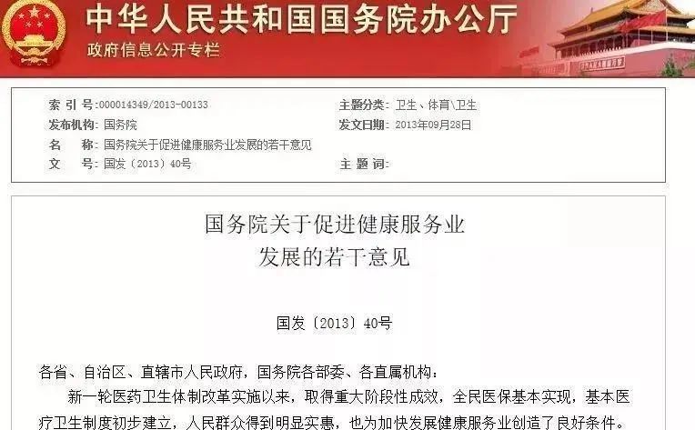 国务院出台《关于促进健康服务业发展的若干意见》【国发2013(40号)】文件指出:健康服务业成为推动我国经济转型升级的重要抓手,到2020年,总规模将达到8万亿以上。其中主要任务第七条明确要求,健全人力资源保障机制,加大健康管理师等人才培养和职业培训力度。